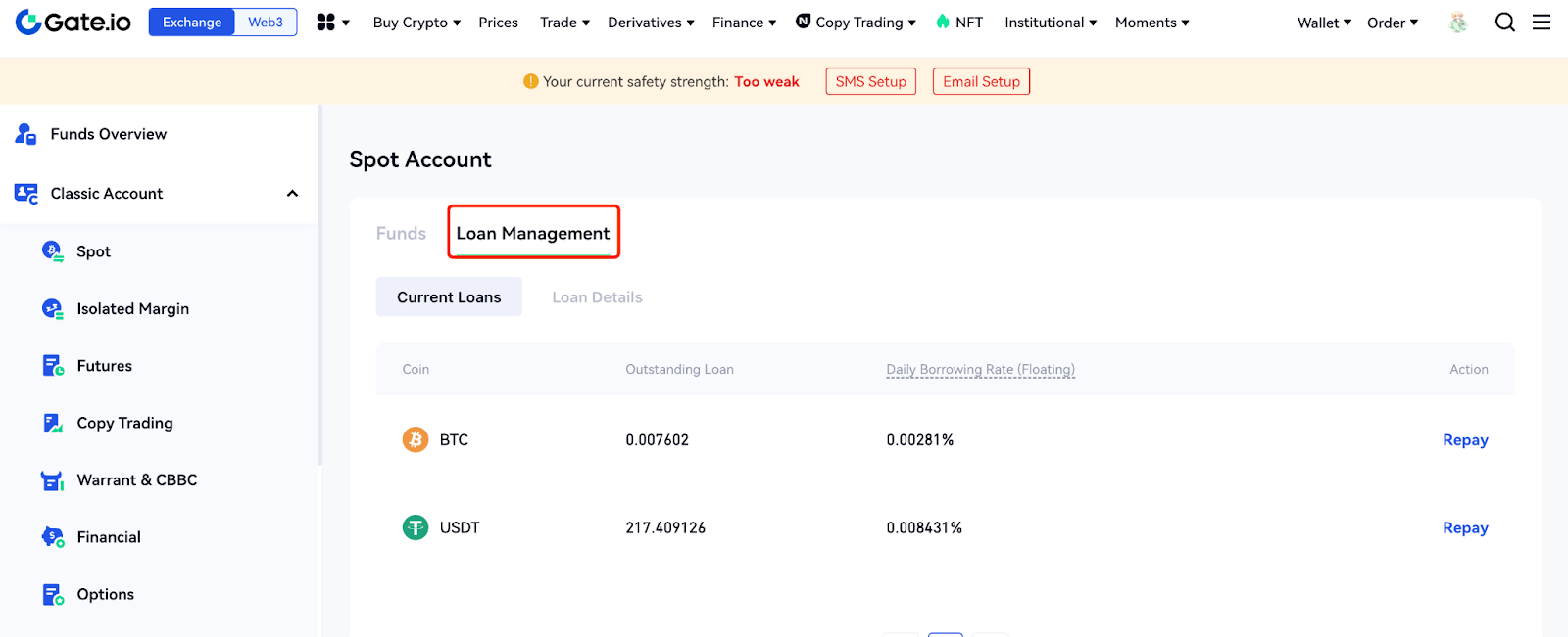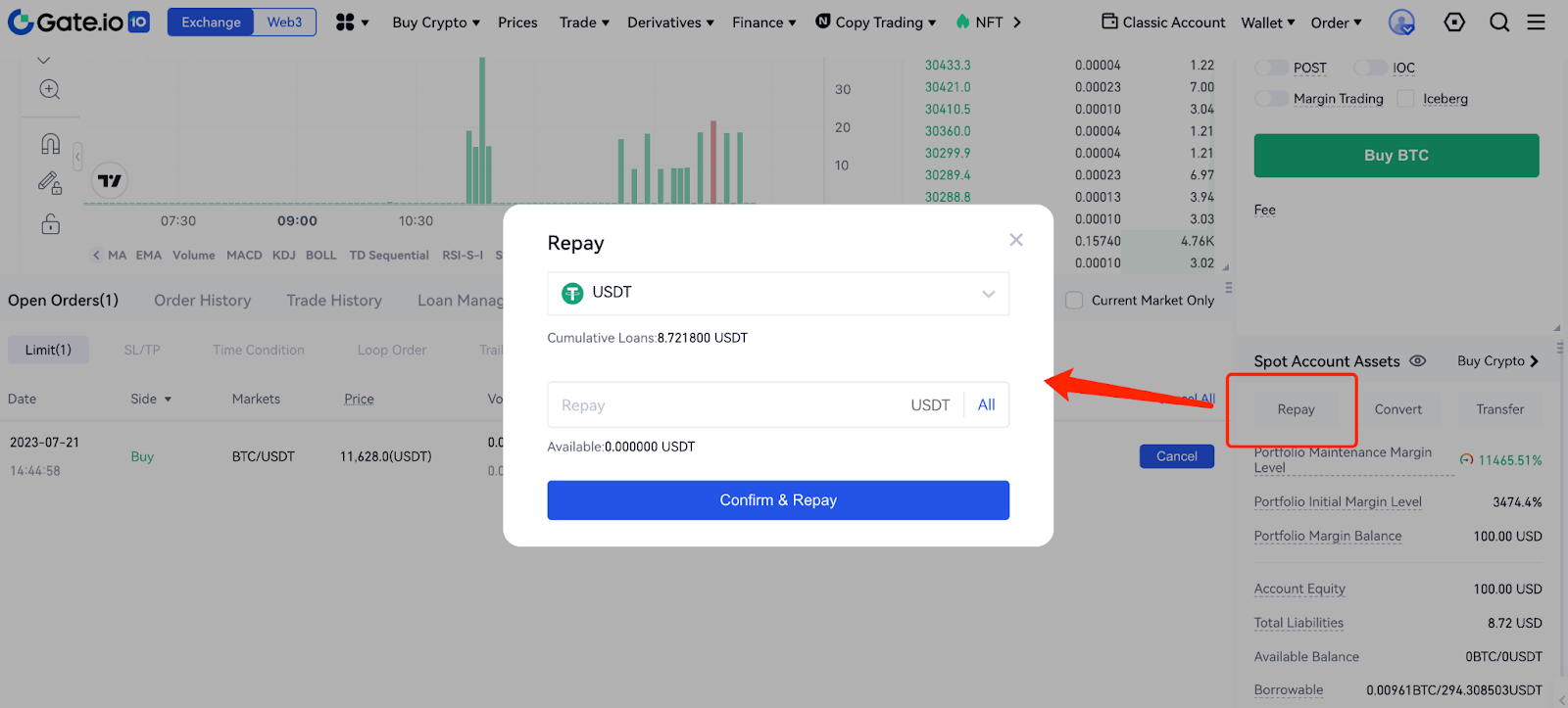 At the bottom right of the spot trading page, you can view the "Spot Account Assets". You can click “Repay” to repay your loans.