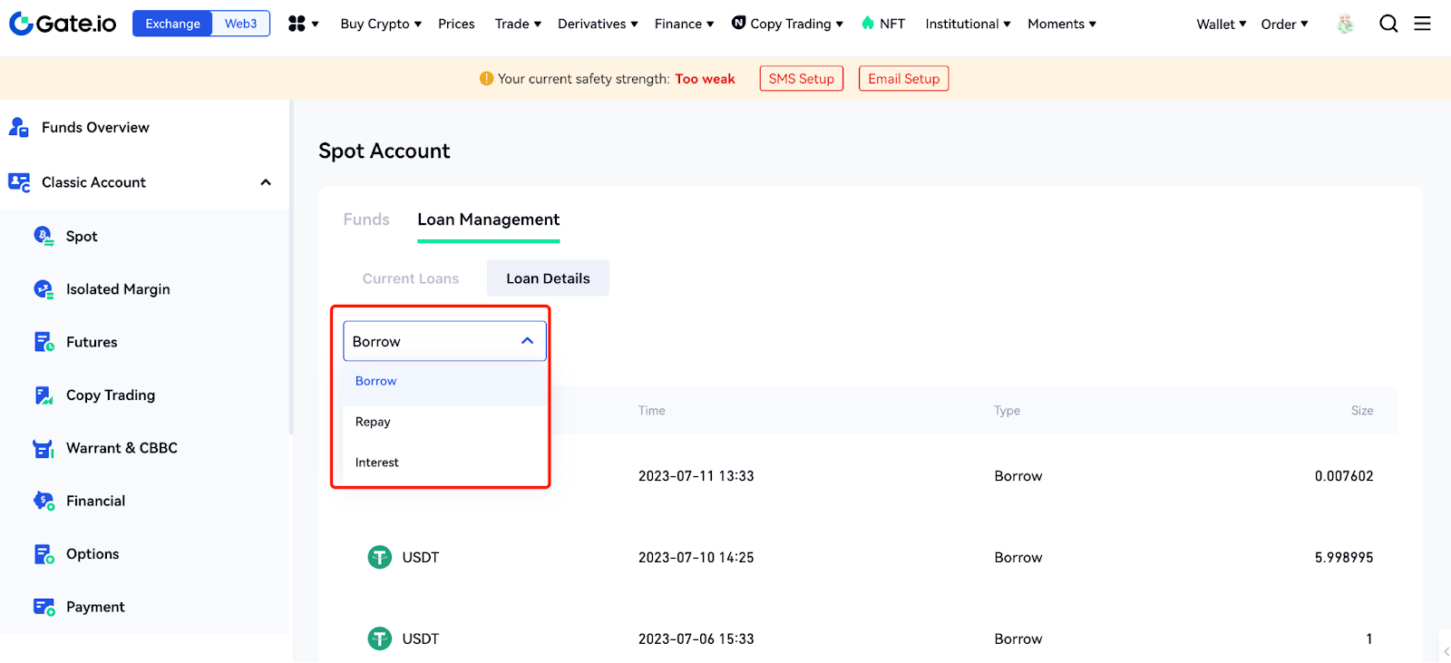 Click "Loan Management" - "Loan Details" and you can view the history of borrowing, repayment, and interest.