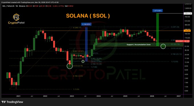 يسأل CryptoPatel بوضوح على X: هل أنت تشتري الانخفاض أم تنتظر الأسوأ؟ انحيازه واضح. هبوطي أسفل 70 دولار. تراكم بين 70 دولار و50 دولار. أهداف طويلة الأجل عند 500 دولار و1,000 دولار.