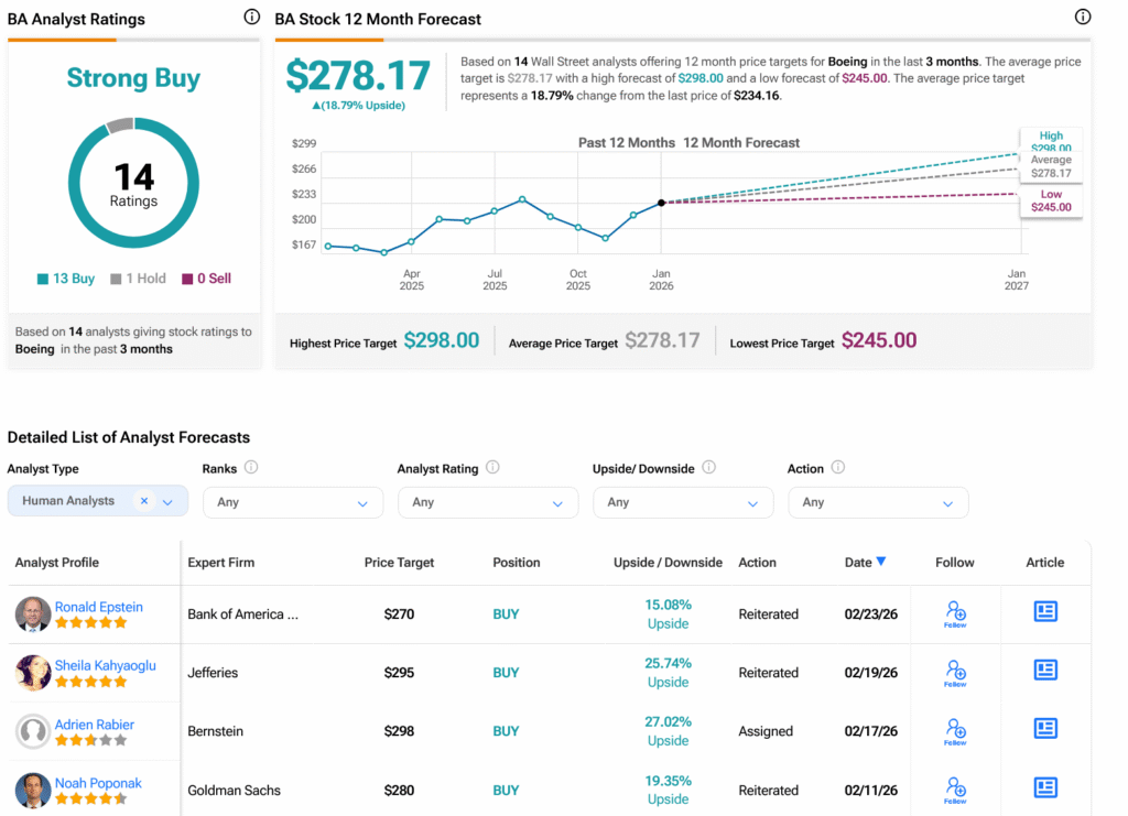 بالنسبة لوول ستريت، لدى المحللين تصنيف “شراء قوي” على سهم BA استنادًا إلى 13 توصية شراء وواحدة احتفاظ خلال الأشهر الثلاثة الماضية، كما هو موضح في الرسم البياني أدناه. بعد ارتفاع سعر السهم بنسبة 29.26% خلال العام الماضي، فإن الهدف السعري المتوسط للسهم البالغ 278.17 دولارًا يشير إلى إمكانات ارتفاع بنسبة 18.79%.