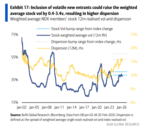 ويذكر التقرير أن تأثير ذلك على مستوى المؤشر: تقدر بنك أوف أمريكا أن التأثير الأولي للشركات الكبيرة الجديدة المدرجة على تقلبات مؤشر NDX سيكون إيجابيًا ولكن معتدلًا (+0.1v)، ومع زيادة حجم الإدراج أو ارتفاع نسبة التداول الحر، يمكن أن يرتفع التأثير إلى +1.1v.