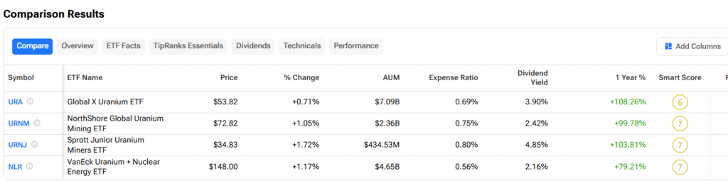 Usando la herramienta de comparación de ETFs de TipRanks, los traders pueden ver cuál de los ETFs de uranio listados arriba es el mejor. Uno de los favoritos entre los inversores es el Global X Uranium ETF. A los traders les gusta URA por su AUM de 7.09 mil millones de dólares, una ratio de gastos del 0.69%, un rendimiento por dividendo del 3.9% y una ganancia de 108.26% en 12 meses.