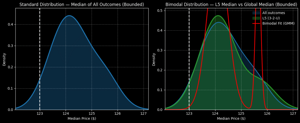 Imagen que muestra distribuciones estándar y bimodales para las acciones de WMT. Crédito: Joshua Enomoto