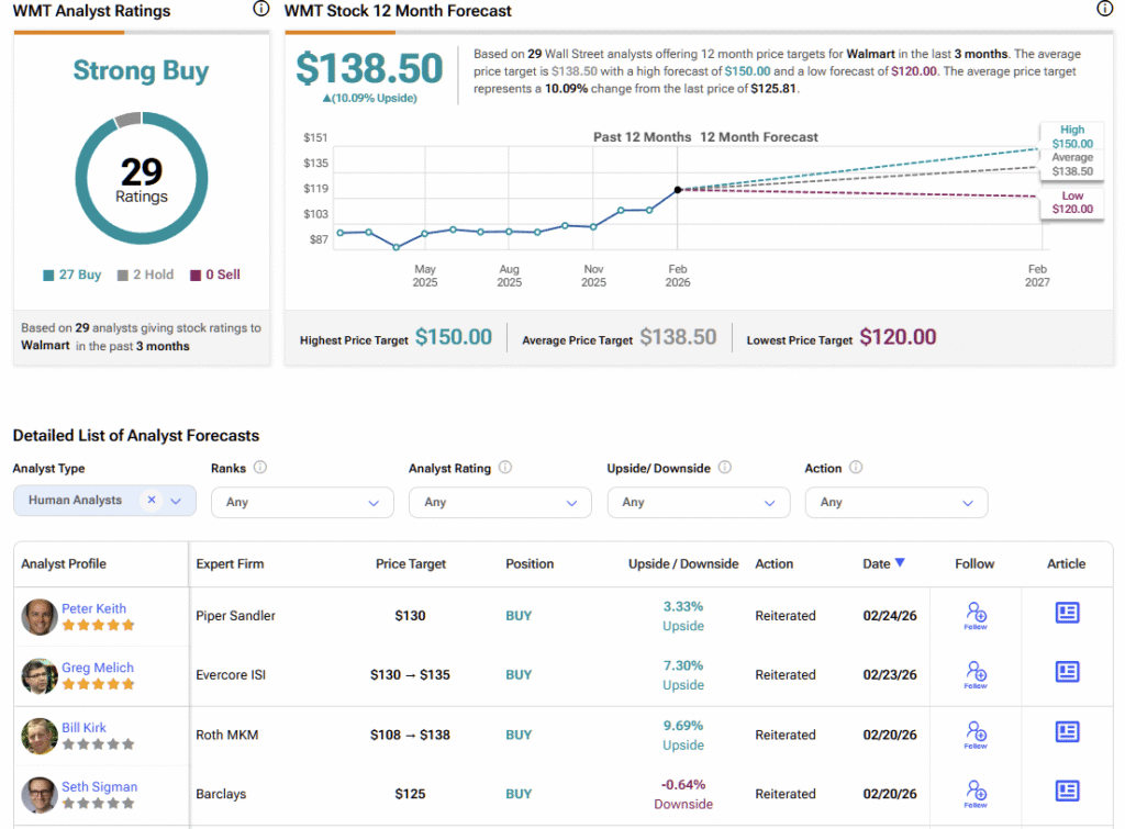 En Wall Street, las acciones de WMT tienen una calificación de Compra Fuerte basada en 27 recomendaciones de compra, dos de mantenimiento y ninguna de venta. El precio objetivo promedio de WMT es de $138.50, lo que implica un potencial de subida de aproximadamente el 10% en los próximos 12 meses.
