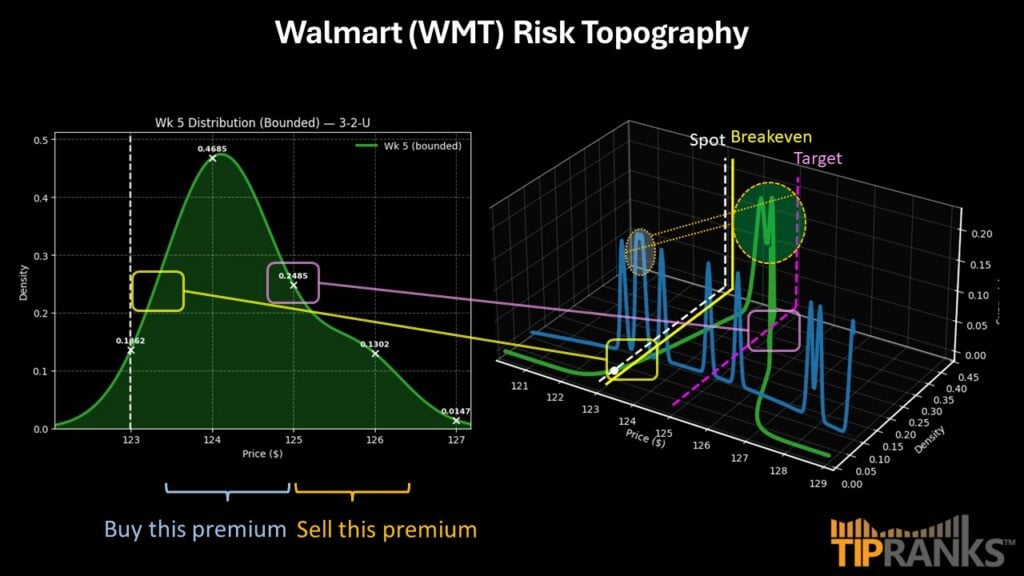 Si aceptamos la premisa anterior, podemos calcular una distribución a cinco semanas para las acciones de WMT, con un rango de $122 a $128 y una densidad de probabilidad que alcanza su pico cerca de $124. Realísticamente, eso haría que la estrategia de compra de llamadas alcistas 120/125 que expira el 20 de marzo sea probablemente la operación más atractiva. Esta apuesta tiene un precio de equilibrio de $123.20, pero el problema es que el pago máximo es solo un poco más del 56%.