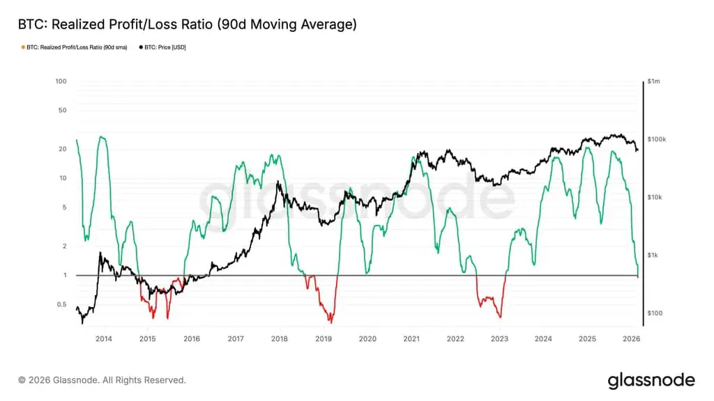 Primero, la relación de ganancias y pérdidas realizadas, que mide la rentabilidad general del mercado, ha enviado una señal histórica. La media móvil simple de 90 días (90D-SMA) de este indicador ha caído por debajo de 1, lo que indica que el mercado actualmente está en una fase de realización de pérdidas excesivas, es decir, las pérdidas realizadas en ventas superan las ganancias. Históricamente, cuando este indicador cae por debajo de 1, el mercado suele tardar seis meses o más en recuperarse. Solo cuando vuelve a situarse por encima de 1, generalmente se considera que la liquidez comienza a regresar de manera sustancial al mercado de criptomonedas.