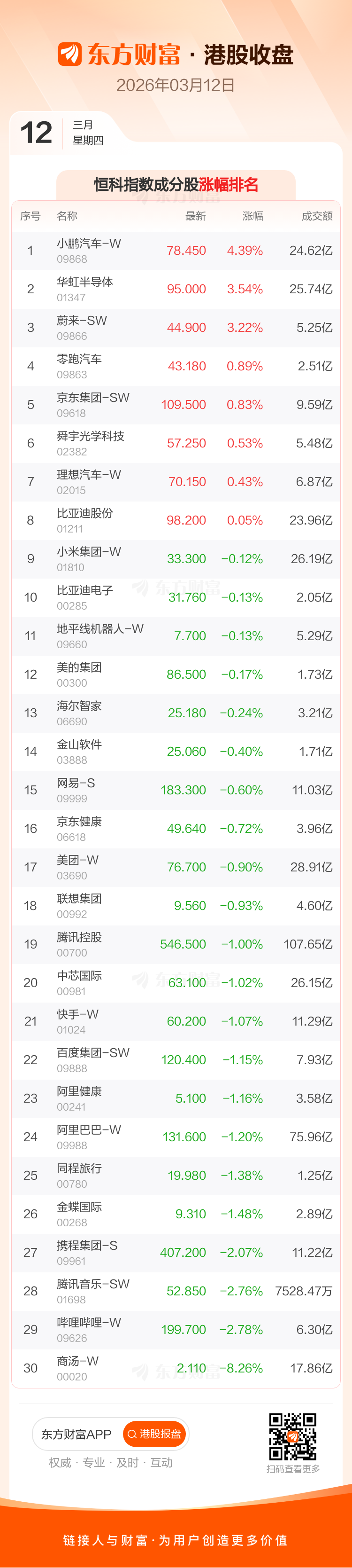 El cierre del mercado de Hong Kong el 12 de marzo fue a la baja, con el índice Hang Seng cerrando en 25,716.76 puntos, una caída de 182.0 puntos, un 0.7%; el índice Hang Seng Tech cerró en 5,027.64 puntos, una caída de 27.21 puntos, un 0.54%. Entre las acciones que componen el índice Hang Seng, JD Logistics, China Hongqiao y China National Offshore Oil Corporation tuvieron las mayores subidas, mientras que CSPC Pharmaceutical Group, Nongfu Spring y Luoyang Molybdenum tuvieron las mayores caídas. Entre las acciones del índice Hang Seng Tech, XPeng Motors-W, Huahong Semiconductor y NIO-SW lideraron las subidas, mientras que SenseTime-W, Bilibili-W y Tencent Music-SW registraron las mayores bajadas.