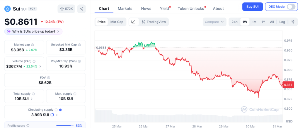 SUI s’est échangé à 0,86 $ le 30 mars, selon CoinMarketCap. Le token de couche 1 a chuté de 83 % par rapport à son pic de janvier 2025 à 5,35 $, malgré le fait que T. Rowe Price l’a nommé dans un dépôt ETF. La reprise dépend de la rotation plus large des tokens de couche 1 et de l’activité soutenue des développeurs.