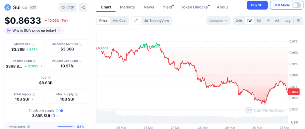 SUI s’échange à 0,86 $ sur CoinMarketCap, en construisant au-dessus de 0,70 $ alors que des projets de gaming adoptent le réseau.
