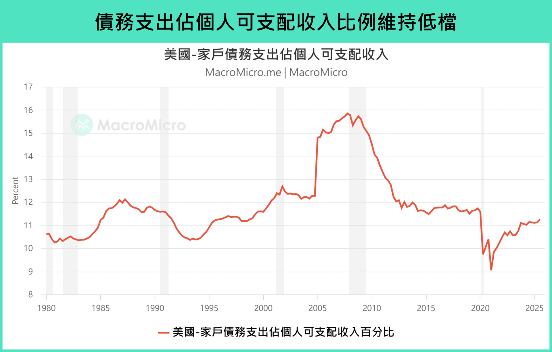 💡 La santé de l'endettement privé aux États-Unis est stable, car la part de la dette des entreprises et des ménages dans le PIB continue de diminuer. La part de la dette des ménages a atteint un niveau historiquement bas depuis les années 2000, et leur dépense en dette par rapport au revenu disponible reste à un niveau bas depuis 20 ans.
