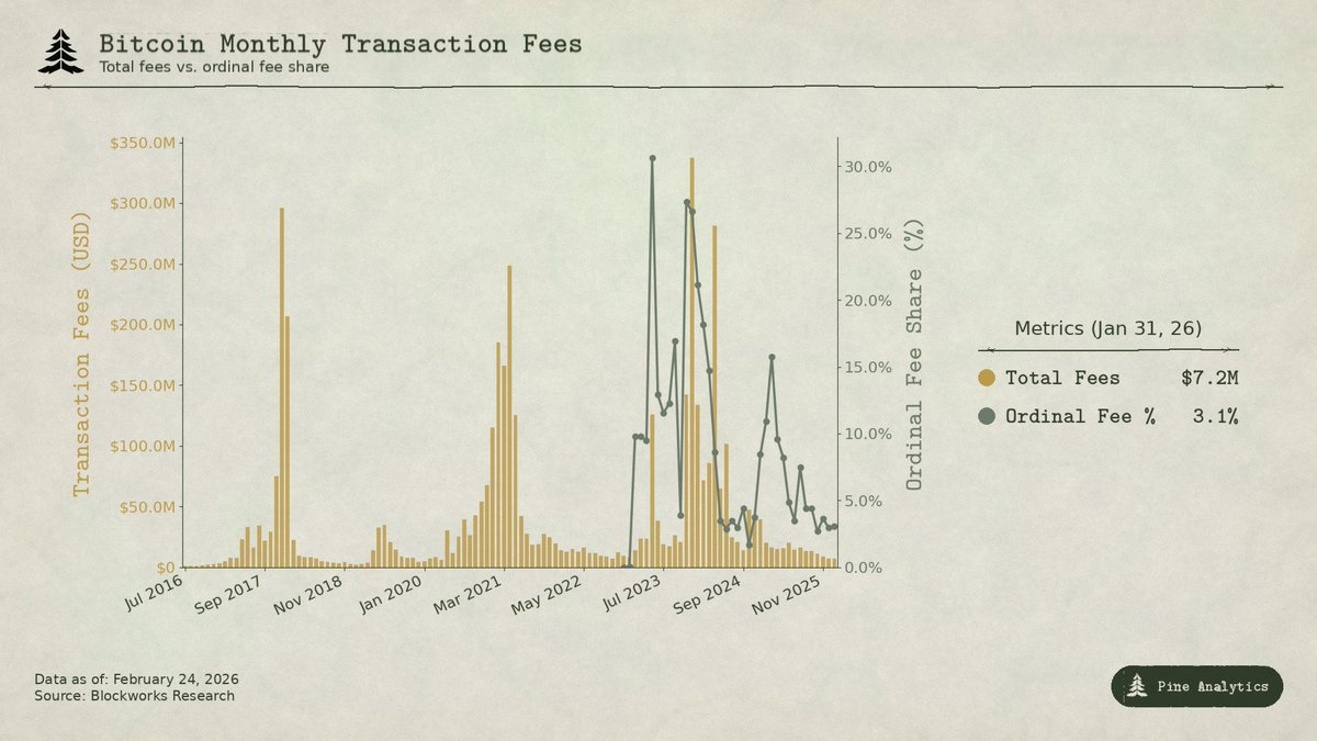 Lonjakan biaya Ordinals dan Runes sempat mendorong biaya hingga 50% pendapatan penambang pada April 2024, namun turun di bawah 1% pada pertengahan 2025 seiring pematangan tooling. Lonjakan ini lebih menyerupai MEV daripada kemacetan, didorong oleh infrastruktur yang belum matang di sekitar aset baru daripada permintaan settlement BTC.