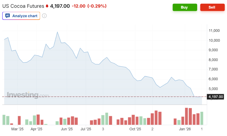Dan maksud saya liar. Pada Februari 2026, harga kakao diperkirakan hampir USD 4.197 per ton, turun 62% dalam waktu sembilan bulan yang luar biasa. Jika Anda hitung, bukankah itu brutal?