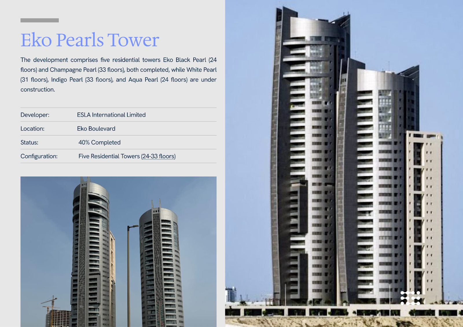Pengembangan ini terdiri dari lima gedung pencakar langit residensial: Eko Black Pearl (24 lantai) dan Champagne Pearl (33 lantai), keduanya sudah selesai, sementara White Pearl (31 lantai), Indigo Pearl (33 lantai), dan Aqua Pearl (24 lantai) sedang dalam pembangunan. Secara kolektif, gedung-gedung yang sudah selesai telah menetapkan standar untuk hunian mewah di Eko Atlantic, menyediakan lebih dari 560 apartemen satu hingga tiga kamar tidur, termasuk duplex dan penthouse teras, serta fasilitas seperti lapangan tenis, kolam renang, dan klub kesehatan.
