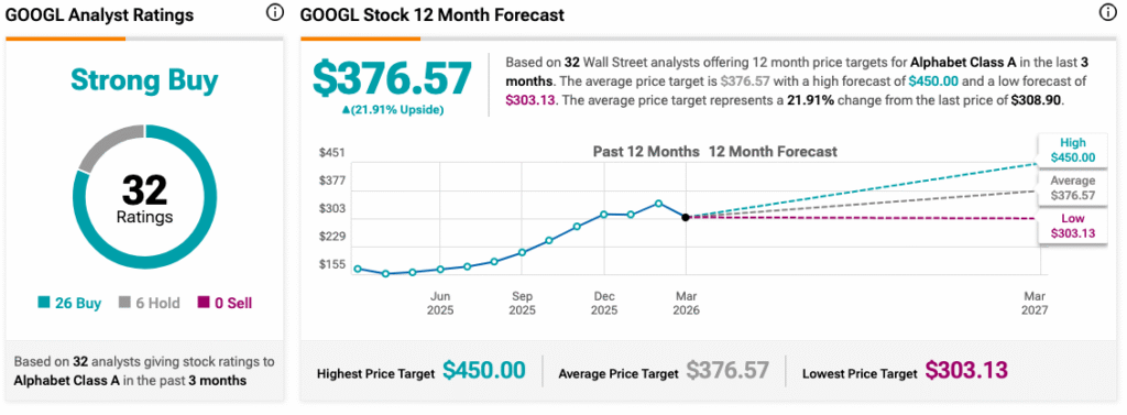 GOOGL tetap menjadi pemain utama di antara saham AI. Sentimen pasar secara umum tetap optimis terhadap GOOGL, dengan analis mempertahankan peringkat “Beli Kuat” karena pertumbuhan perusahaan dalam kecerdasan buatan dan layanan cloud. Para analis juga memproyeksikan potensi kenaikan sebesar 21,7%, yang dapat mendorong harga saham dari sekitar $309 saat ini menjadi $376.