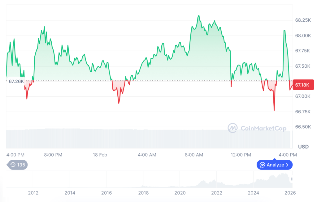 ビットコインはやや上昇し、2月18日時点で約67,340ドルとなっています。これは、広範な市場の穏やかな上昇を反映したもので、今日のビットコイン価格ニュースを牽引する単一の要因はなく、最近の圧力後の技術的な調整と、売り圧の緩和によるものと考えられます。