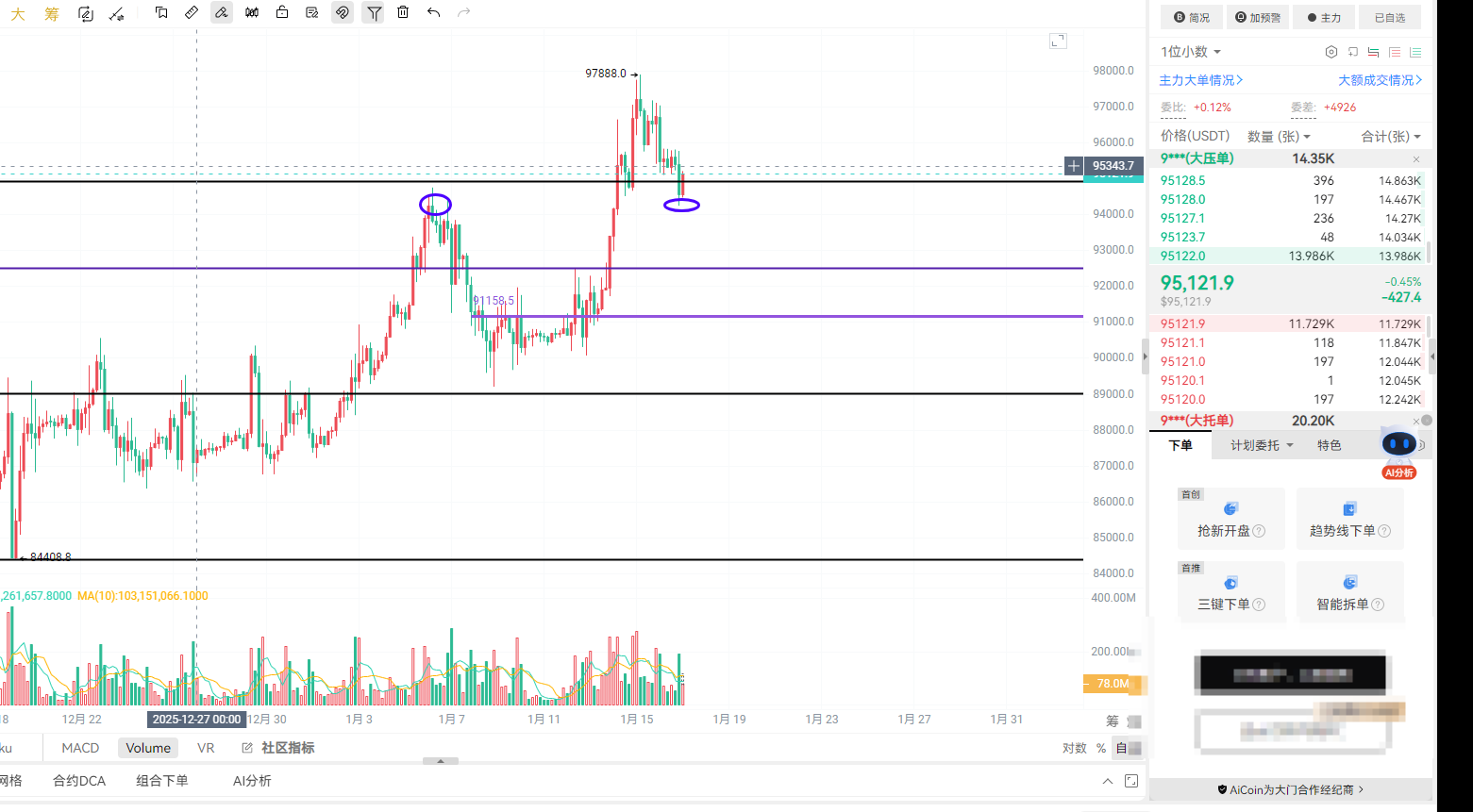 **ホットトピック|****1:【David Sacks:暗号市場構造立法はこれまで以上に近づいており、暗号業界は現在の緩衝期間を利用して残る意見の相違を解決すべき】****2:【ハセット:FRB議長職を受け入れる場合、独立性を維持することを約束】**ビットコインイーサリアムの今日の動きは、木曜日に大きく上昇し98000付近まで達した後、短期的な調整が入り、現在は最低94200付近まで下落、調整幅は3.72%。木曜日の記事で述べたように、この上昇は典型的な感情面による市場の買い戻しの再開だった。金曜日のこの調整は、木曜日に追い高した追随買いを消化する動きに近い。BTC:12時間足から見ると、95000付近は年末最後の方向性の分岐点となる。もし大きく二次的に95400を割って安定すれば、次の抵抗帯は102700付近。今のところ、いくつかの**重要なポイント**を覚えておくことが大切。**95000付近は買い手の防衛ライン。96800-97200は震荡の中軸。98000は短期の突破圧力ライン。99500は出来高を伴った買い圧力の確認ポイント。**95000を割らずに反発すれば、空売りは避けて買いポジションを持つ。97000で横ばいになった場合は利益確定し、新たな方向性を見極めて再エントリー。99500で安定すれば、引き続き買いを継続。ETH:イーサリアムは現在のチャートから見ると、全体的な突破力はビットコインよりも弱く、3250付近で震荡中。下値は3230-3200付近で何度も反発確認。ビットコインがサポートを割らなければ、イーサリアムも上方の抵抗線3350-3380を再度試す動きに入り、抵抗線の切り替えを目指す。操作戦略は、下値での買いを中心に。土日全体の流動性はやや低めなので、エントリーポイントをじっくり待ち、利益が出たらすぐに確定するのが良い。本当に利益を出す人は、最も早く反応する人ではなく、他者が疑い始めたときにすでに乗っている人だ。市場のトレンドに従うことで、より遠くまで行けるし、市場で結果を出す人たちだ。過去のこの上昇局面で私が何度も強調したのは、今の暗号市場の根底のロジックが変わったということだ。市場の動きを決める要素は以前よりも複雑になり、その複雑さは過去の牛市や熊市では経験しなかったものだ。私はトミー、トレードと修行を並行するBサークルの伴走者だ。リアルタイムのエントリーポイントやカスタム戦略に興味がある方は、私のホームページをクリックしてコミュニティに参加してください。専門の実践トレード講師が24時間サポートし、冷静さを保つ手助けをします。一人で無理をしないように。ポイントには有効期限があり、投稿には遅延があるため、具体的な取引はリアルタイムの相場を基準にしてください。最後に、私の前回の記事で触れた今週の二つのポイントを覚えておいてください。短期的には試し買いを中心にし、目標範囲から外れたら年末までに大きな利益を得る最後のチャンスです。私はK線人生のトミー、あなたの暗号資産リアルタイム管理者です。