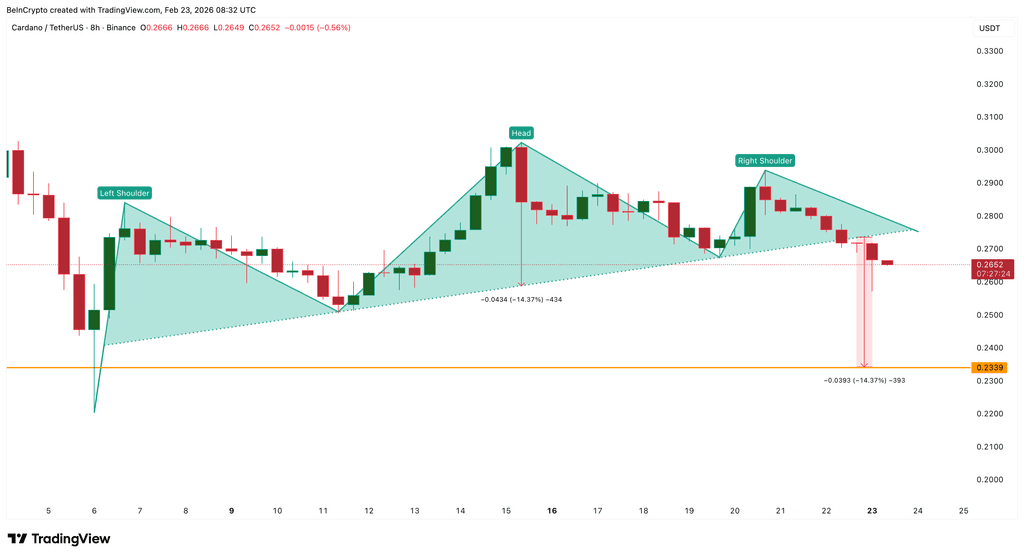8時間足チャートでは、ADAはヘッドアンドショルダーのネックライン割れを確認済みで、典型的なトレンド反転シグナルです。価格は$0.266の重要サポートを下回り、現在は$0.2572付近で推移しています。