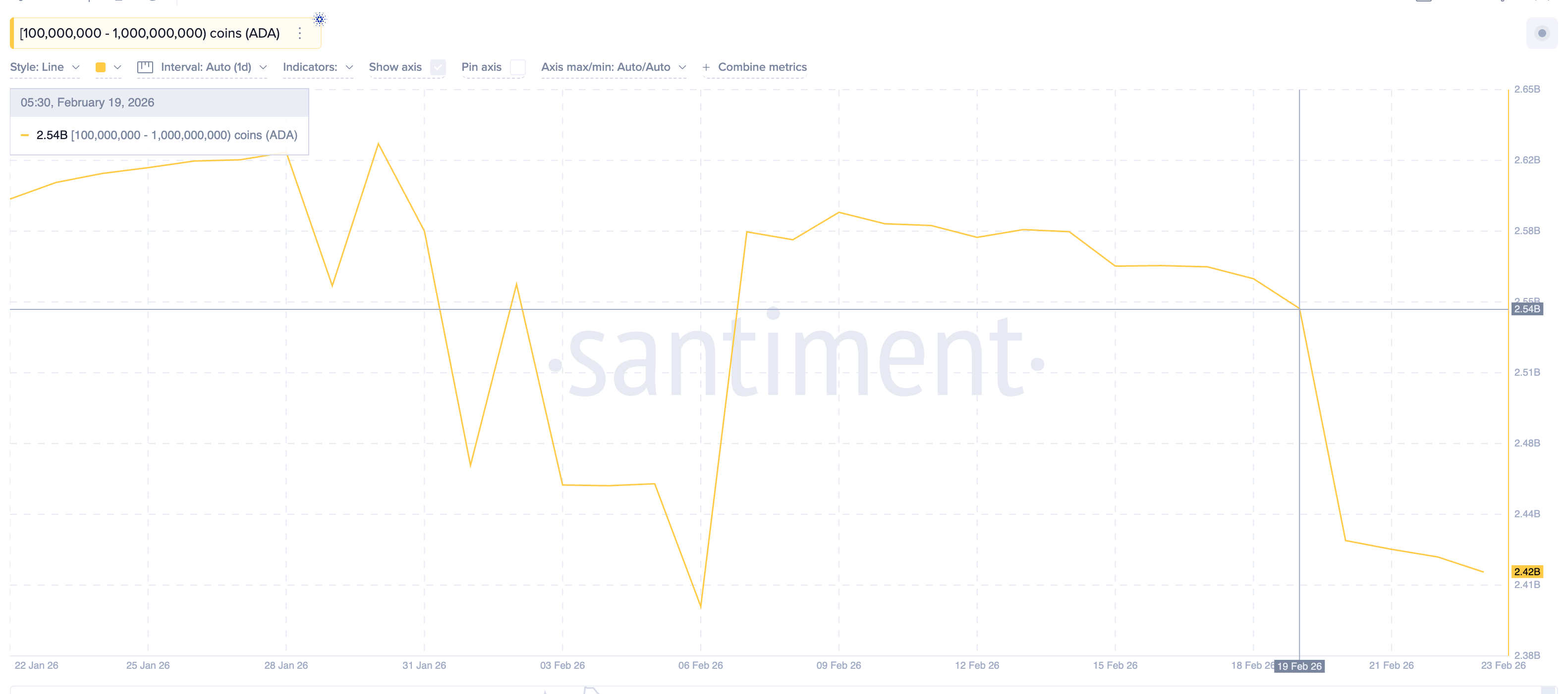 オンチェーンデータによると、Cardanoの巨大鲸鱼は下落前に先手を打っていました。1億~10億ADAを保有する最大鲸鱼グループは、2月19日から23日にかけて保有量を25.4億ADAから24.2億ADAに減少させ、約1.2億ADA(約3,000万ドル)を売却しました。