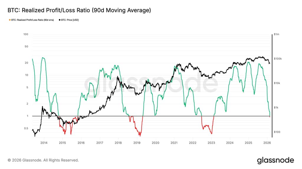 まず、市場全体の収益性を測る「実現損益比率」は歴史的なシグナルを放っている。この指標の90日単純移動平均(90D-SMA)が1を下回ったことは、市場が過剰な損失の実現を伴っていることを意味し、投資家が売却時に確定した損失の合計が利益を上回っている状態を示す。過去のデータを振り返ると、この指標が1を下回った後、修復には長くて6ヶ月以上かかることが多い。再び1を超える水準に戻るまでは、流動性の本格的な回復は期待しにくい。