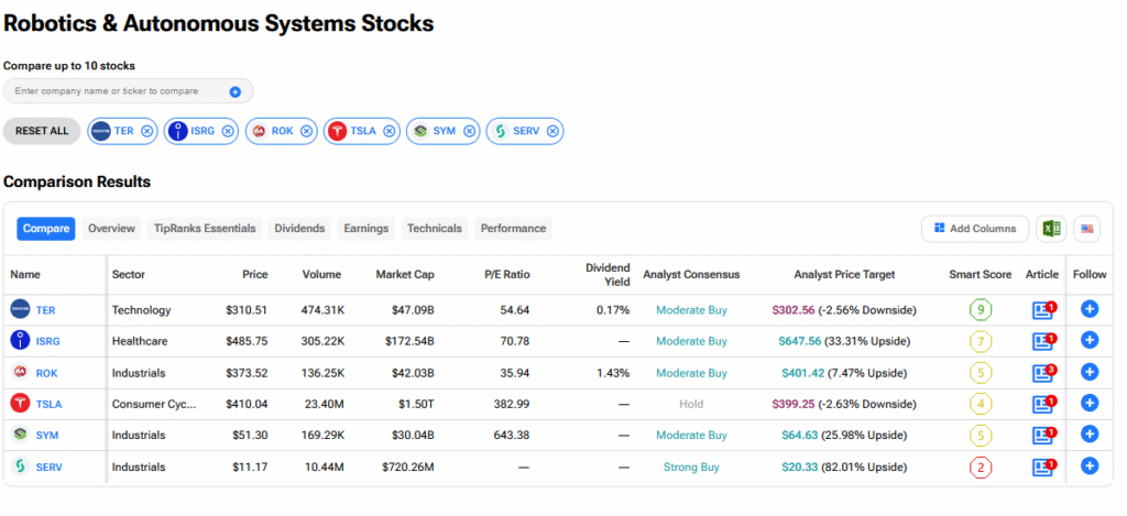 私たちは、TipRanksの比較ツールを使って、今買うべき最高のロボティクス株をまとめました。以下の通り、Serve Robotics SERV +12.51% ▲が最も上昇余地が82.82%と見込まれています。