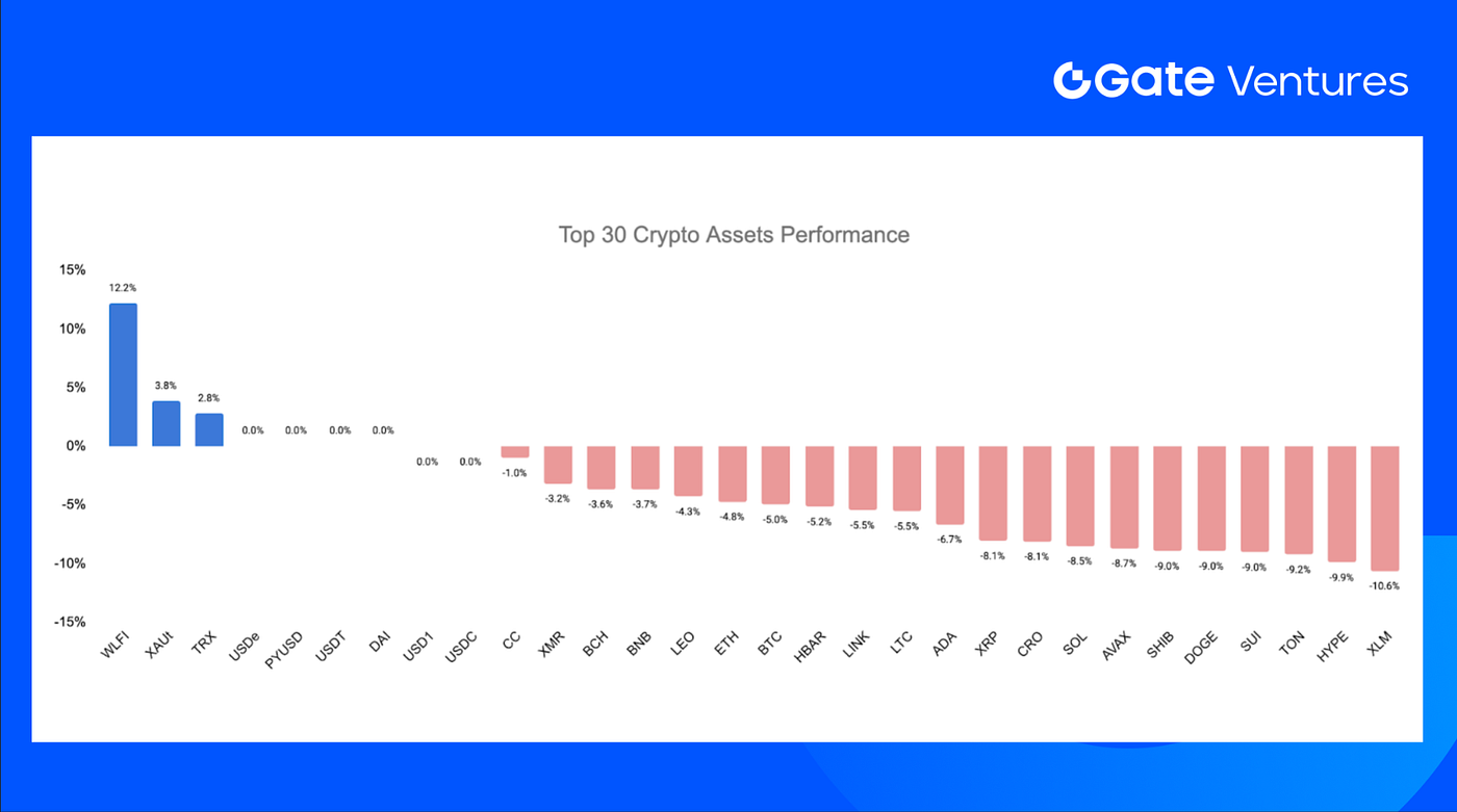Trong nhóm 30 tài sản hàng đầu, giá giảm trung bình khoảng 4,4%, chỉ có WLFI, XAUt và TRX tăng giá.