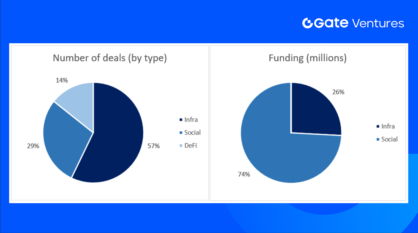 Số lượng thương vụ được chốt trong tuần trước là 7, trong đó Infra có 4 thương vụ, chiếm 57% tổng số thương vụ. Trong khi đó, Social có 2 thương vụ (29%) và Defi có 1 thương vụ (14%).