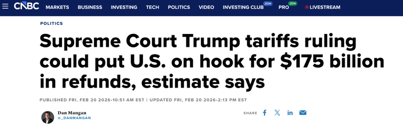 △CNBC reports that, according to Wharton School’s model, the U.S. government may need to pay up to $175 billion in refunds to importers