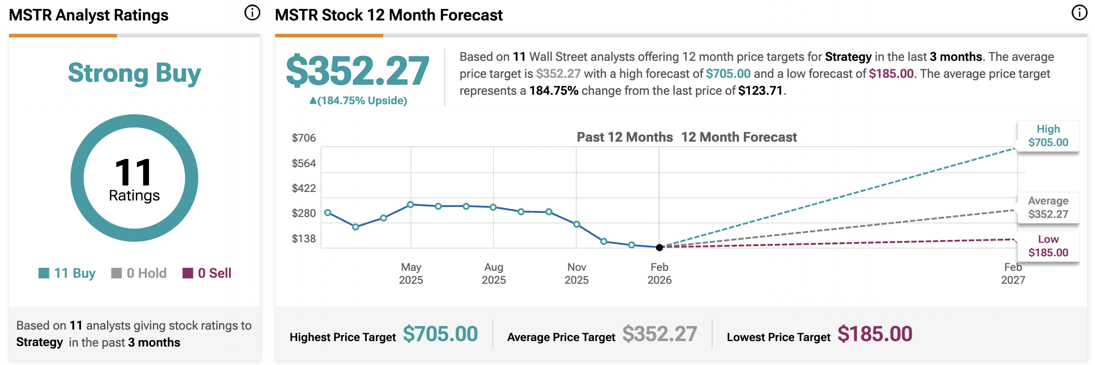 TipRanksによると、Strategy(旧MicroStrategy)の株は、ウォール街の11人のアナリストの間でコンセンサスの「強い買い」評価を受けています。この評価は、過去3ヶ月間に11人全員が買い推奨を付けたことに基づいています。平均12ヶ月の目標株価は352.27ドルで、現状から184.75%の上昇余地を示しています。
