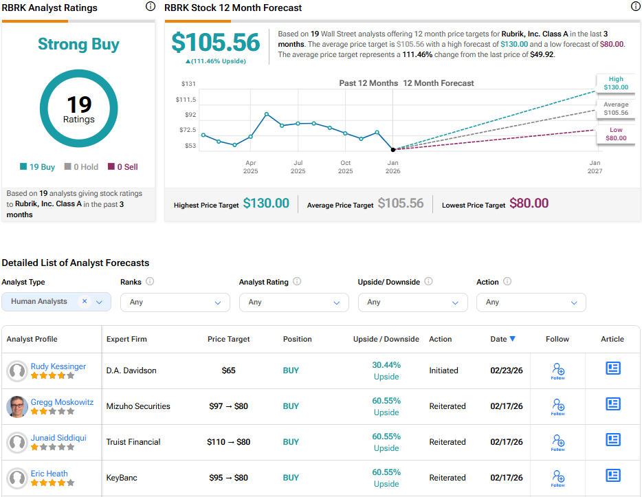 Rubrik RBRK +6.07% ▲ shares jumped on Tuesday after investment firm D.A. Davidson began coverage of the cybersecurity company with a Buy rating and a $65 price target. According to four-star analyst Rudy Kessinger, the recent pullback has created a good opportunity for investors to buy into a fast-growing company at a lower price. He also argued that the cybersecurity market remains healthier than recent negative narratives suggest, and that Rubrik could still benefit from strong demand despite AI worries.