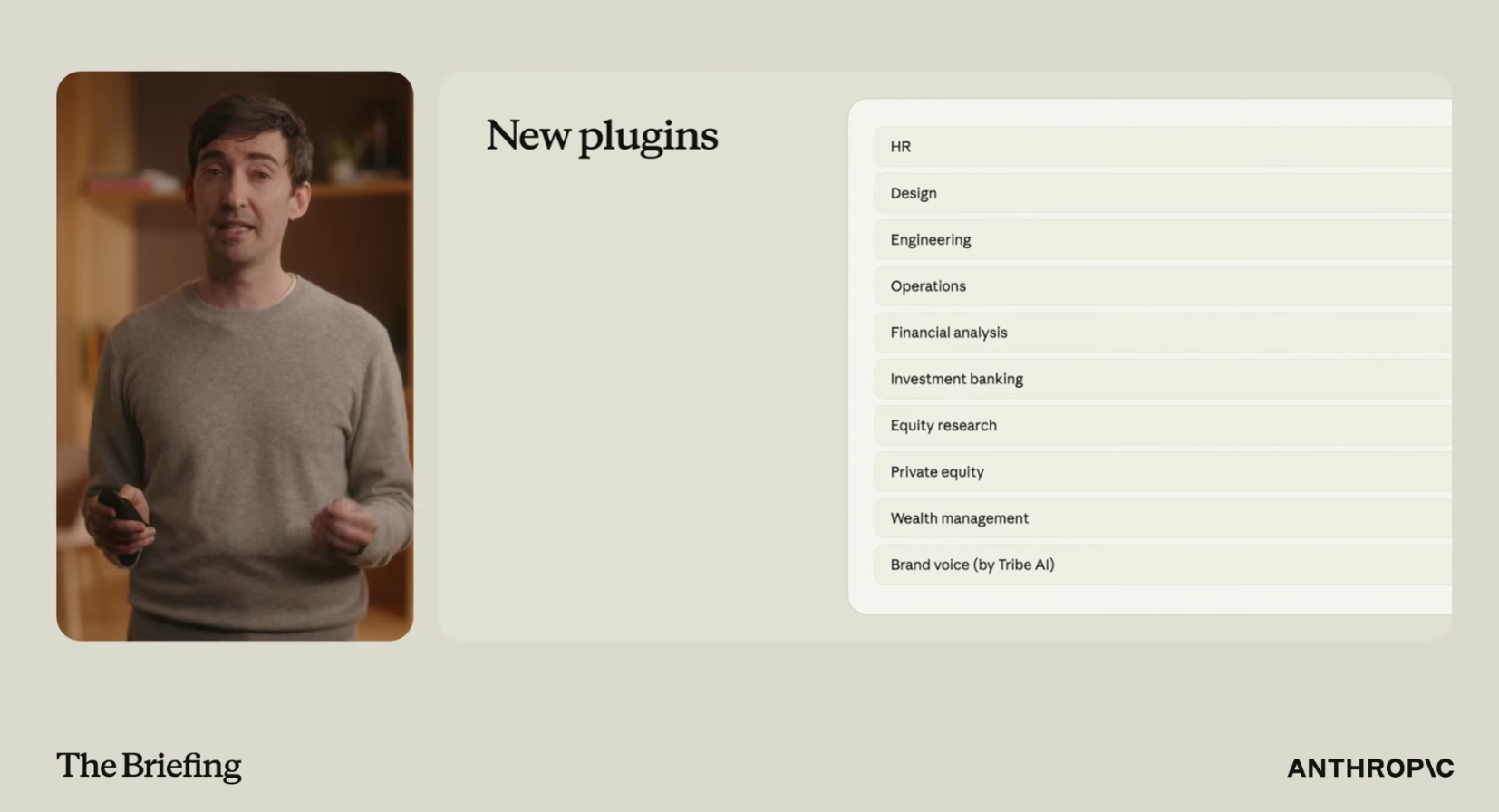 企業向け製品担当のスコット・ホワイトは、プレゼンテーションで、最新のClaude Coworkに追加された10のプラグインのうち半数が資本市場に関係していると明かしました。具体的には金融分析、投資銀行、株式調査、プライベートエクイティ、資産管理です。それ以外にも、デザイン、人事、運営、エンジニアリング、企業ブランディングなどの職場分野もAI大手が新たに進出している領域です。