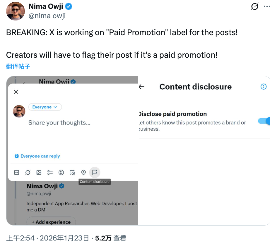 On January 22, researcher Nima Owji discovered a “Paid Promotion” label feature in X’s backend code. Creators will need to check whether a post is paid, and the label will appear directly on the post.