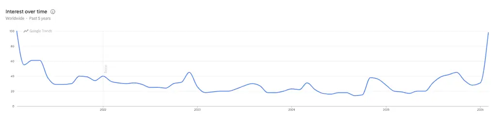 In late February 2026, the crypto market experienced a set of noteworthy data points. Google Trends showed that worldwide searches for “buy bitcoin” surged to their highest level in nearly five years. This peak occurred amid a weak market trend where Bitcoin’s price, after falling from its October 2025 all-time high of $126,080, hovered around the $60,000 range. The significant divergence between search interest and price movement has become a central topic of discussion. This article systematically analyzes the multiple structural factors behind this phenomenon based on objective data and event chains.