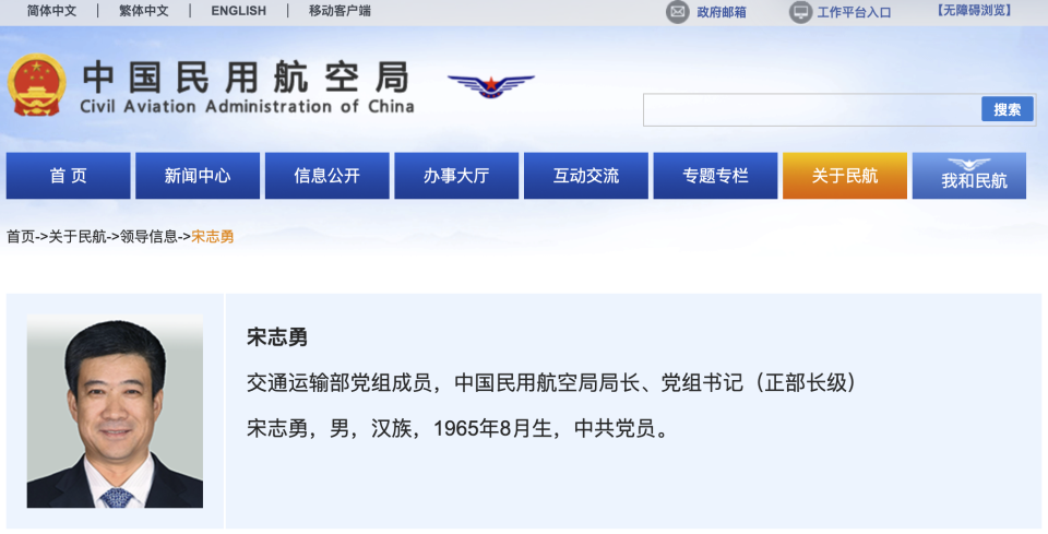 The official website of the Civil Aviation Administration of China has been updated to show that Song Zhiyong, a member of the Party Leadership Group of the Ministry of Transport, Director and Party Secretary of the Civil Aviation Administration of China, has been clearly designated as a full ministerial-level official.