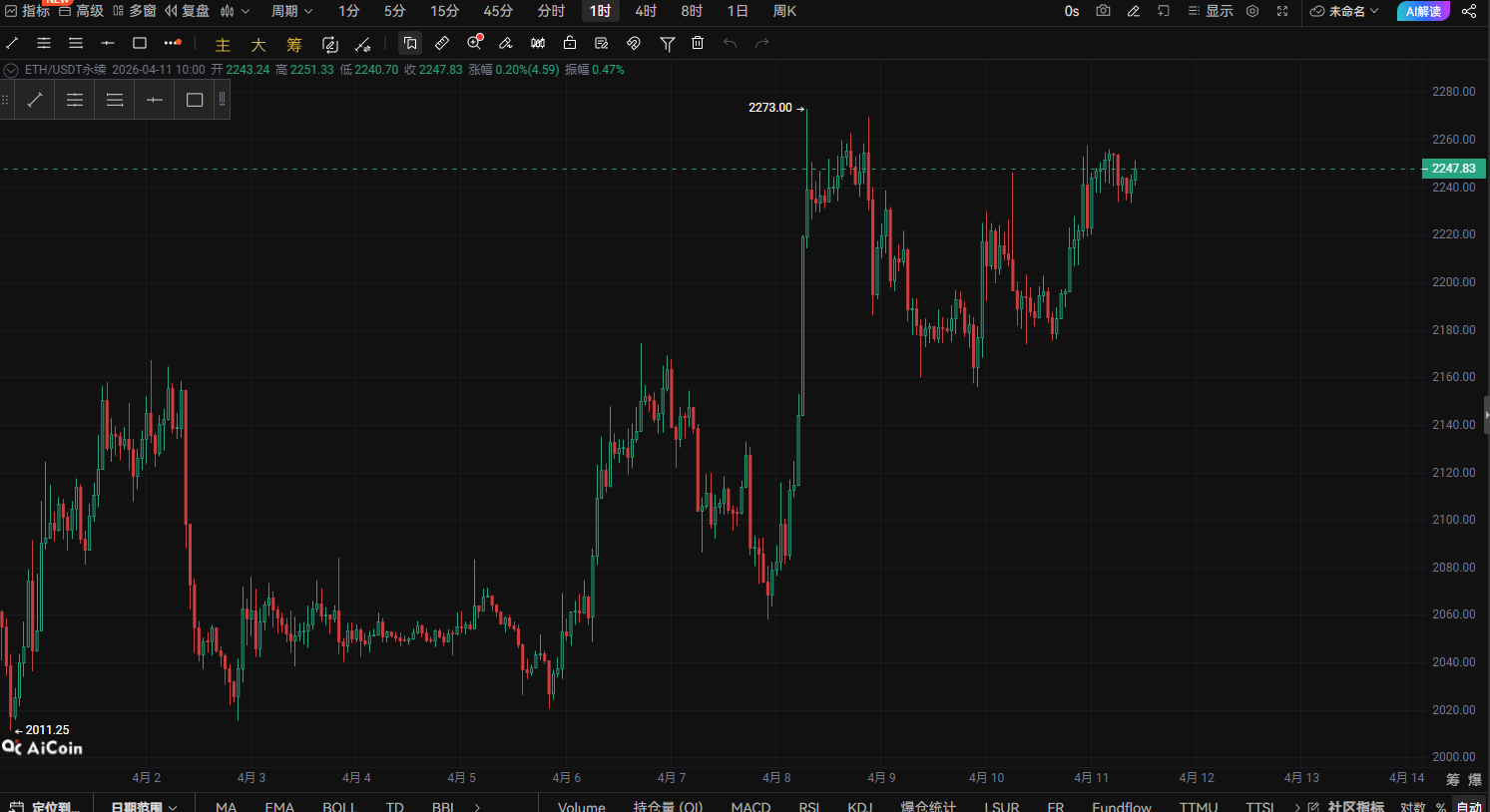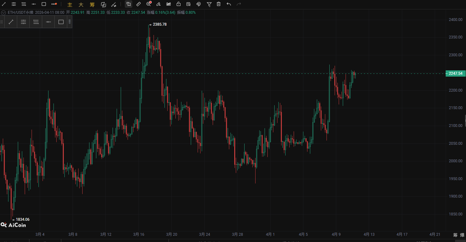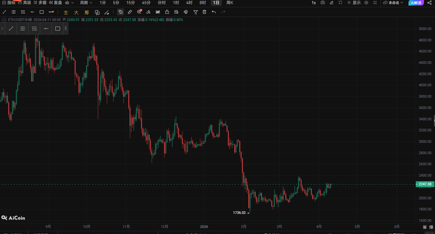 現在 Ethereum ETH の価格は 2246.19 USDT。最近の全体的な動きから見ると、市場は前期の急激な調整を経て、徐々に レンジ修復段階 に入っている。買い圧力は徐々に戻りつつあるが、上方には一定の技術的圧力も存在している。