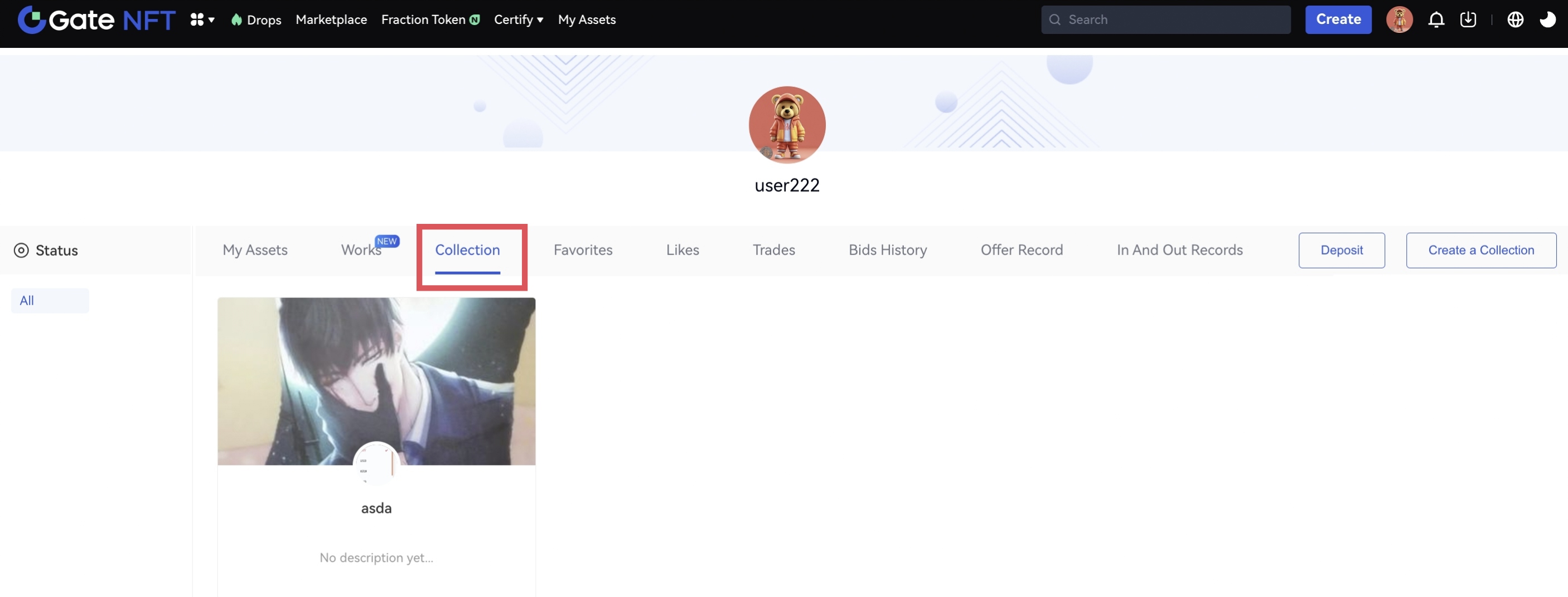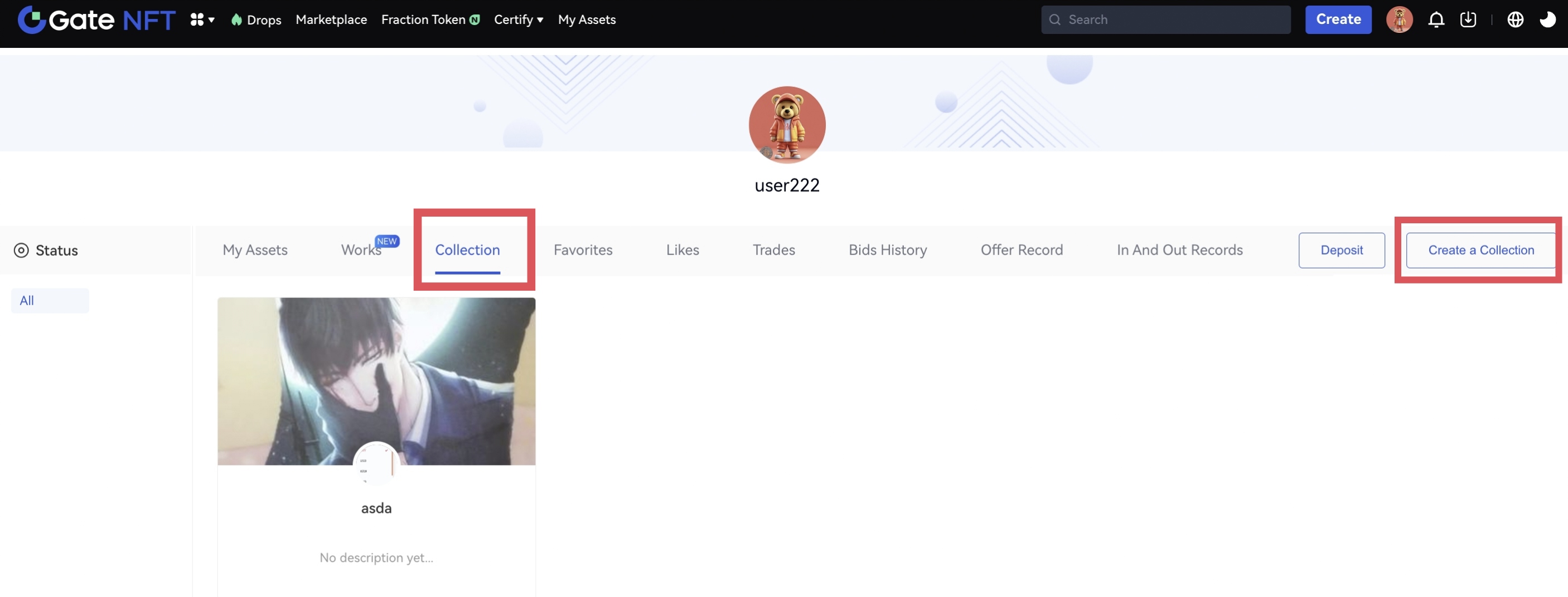 Na página inicial do Gate NFT, clique em “Meus Ativos”, selecione “Coleção” e, em seguida, clique em “Criar uma Coleção” para acessar a página de criação de coleções.
