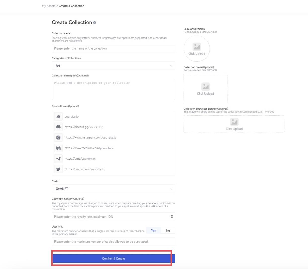 Na página “Criar Coleção”, faça o upload do logotipo da coleção, preencha o nome da coleção, selecione a categoria da coleção na lista suspensa e clique no botão “Confirmar e Criar” para criar uma coleção de NFTs.