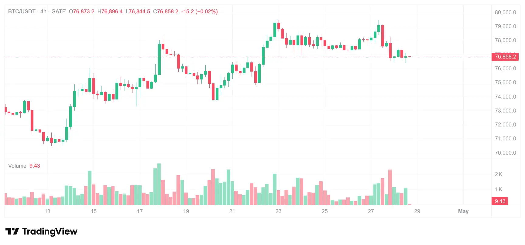 Alta rápida e pico em alta (de 16 a 18 de abril). Em 17 de abril ocorreu o pico de entradas líquidas diárias dentro do período de nove dias, com montante de US$ 664 milhões. No dia, a faixa de negociação intradiária do Bitcoin ficou entre US$ 75.035 e US$ 78.895, mostrando um padrão claro de “subida e recuo” (alta com devolução). Em 18 de abril, a alta continuou, e o fechamento ficou em cerca de US$ 77.128, com alta diária de aproximadamente 2,7%; o pico da fase apareceu perto de US$ 77.000.