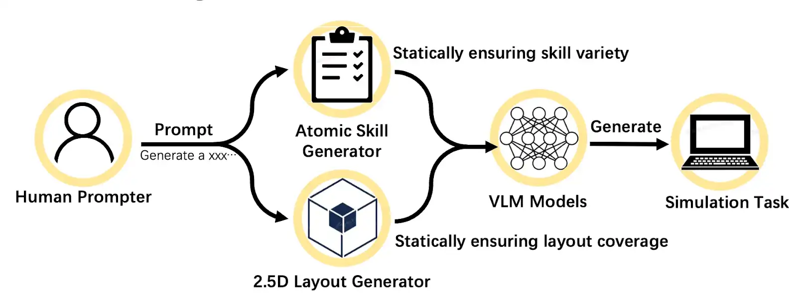 Os limites dos dados determinam os limites das capacidades do robô. A Axis criou um novo motor de geração de tarefas 3D dinâmico, que descompõe as habilidades essenciais do robô em habilidades atômicas, podendo gerar uma vasta quantidade de tarefas de simulação de alta qualidade através de prompts. Desde cenários simples até tarefas complexas em cadeia, o robô pode evoluir continuamente num espaço de tarefas infinitamente rico.
