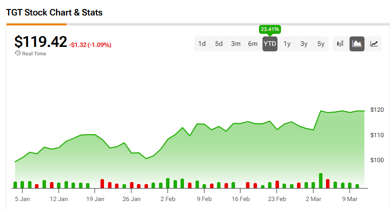 De acordo com Wall Street, a classificação de consenso para a Target é Compra Moderada, baseada em 10 recomendações de Compra, 14 de Manutenção e duas de Venda nos últimos três meses. Com isso, o preço-alvo médio das ações da TGT é de $126,04, representando uma potencial valorização de 5,11% para as ações.