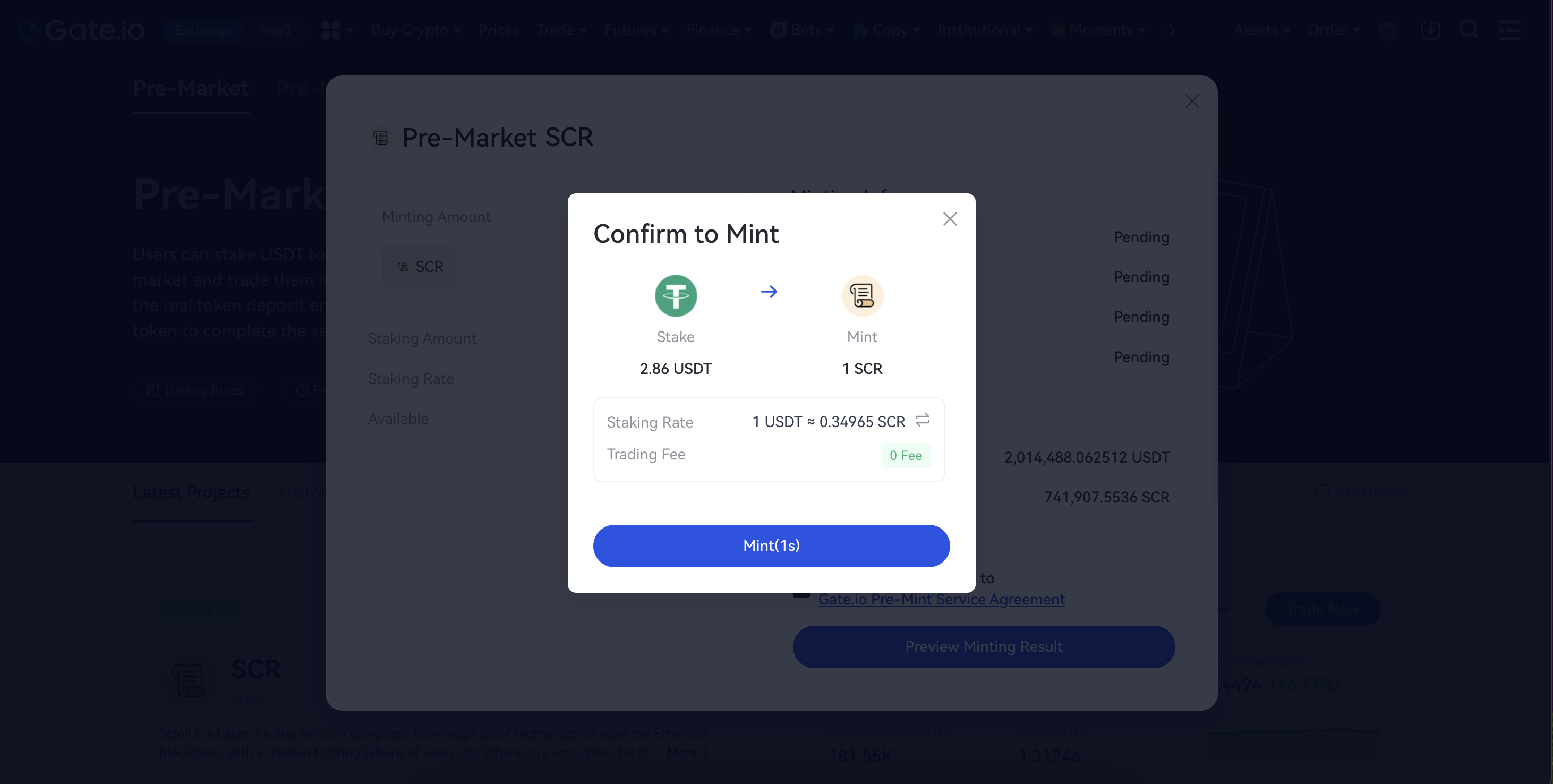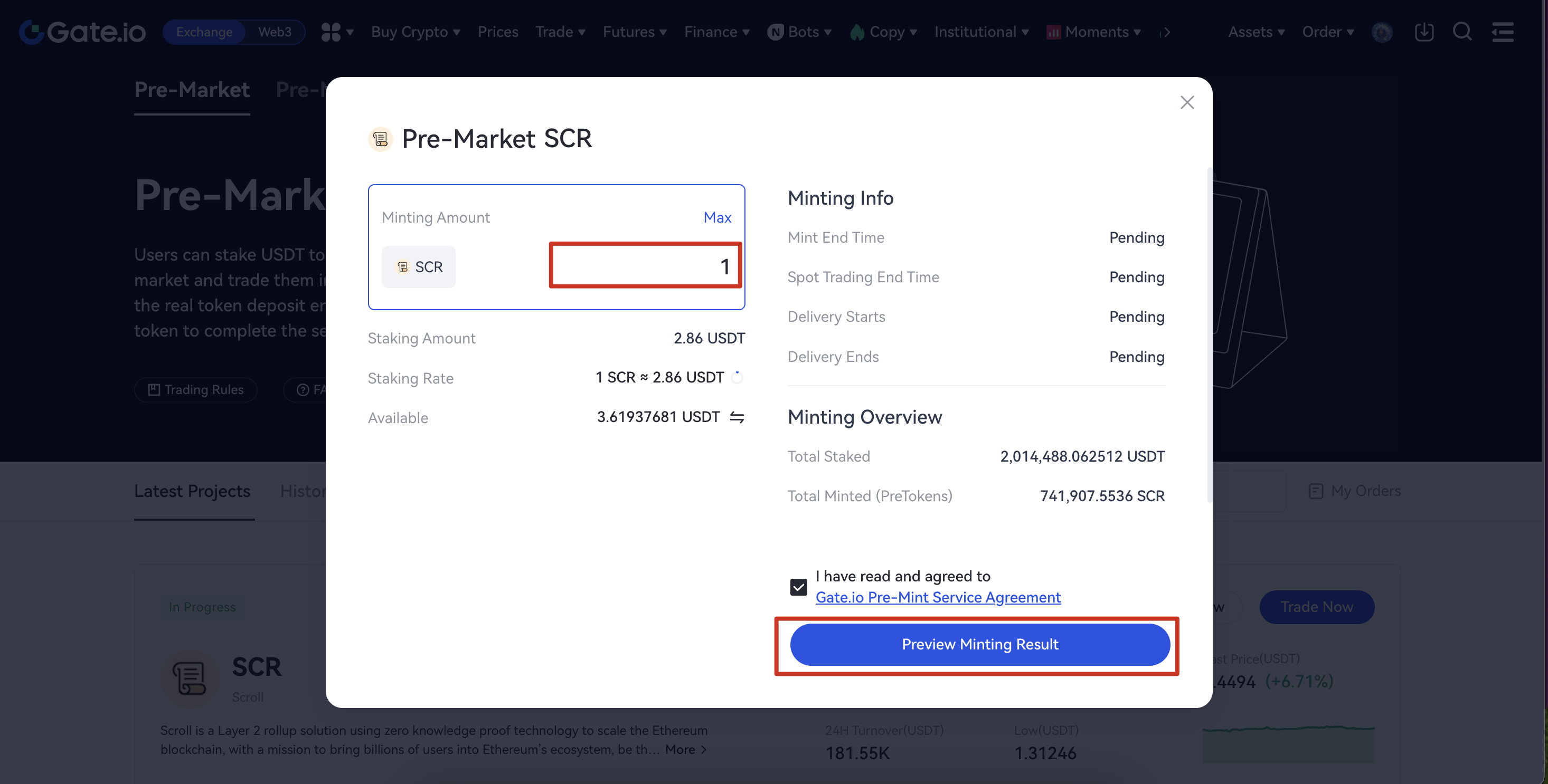The minting entry and the PreToken spot market open within a period of time after the start of Pre-Market OTC trading. Please refer to the Pre-Market announcement for the exact time. You can stake USDT to mint PreToken via the minting function. Minted PreTokens can also be traded in the PreToken spot market.