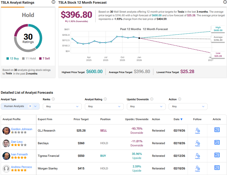 No que diz respeito às empresas de Elon Musk, a maioria delas é de propriedade privada. No entanto, os investidores de retalho podem investir na sua empresa mais popular, a Tesla TSLA +1,27% ▲. Consultando a Wall Street, os analistas têm uma classificação de Manter para as ações da TSLA, com base em 12 recomendações de Compra, 11 de Manter e sete de Venda nos últimos três meses, conforme indicado no gráfico abaixo. Além disso, o preço-alvo médio da TSLA de $396,80 por ação implica um risco de descida de 2%.