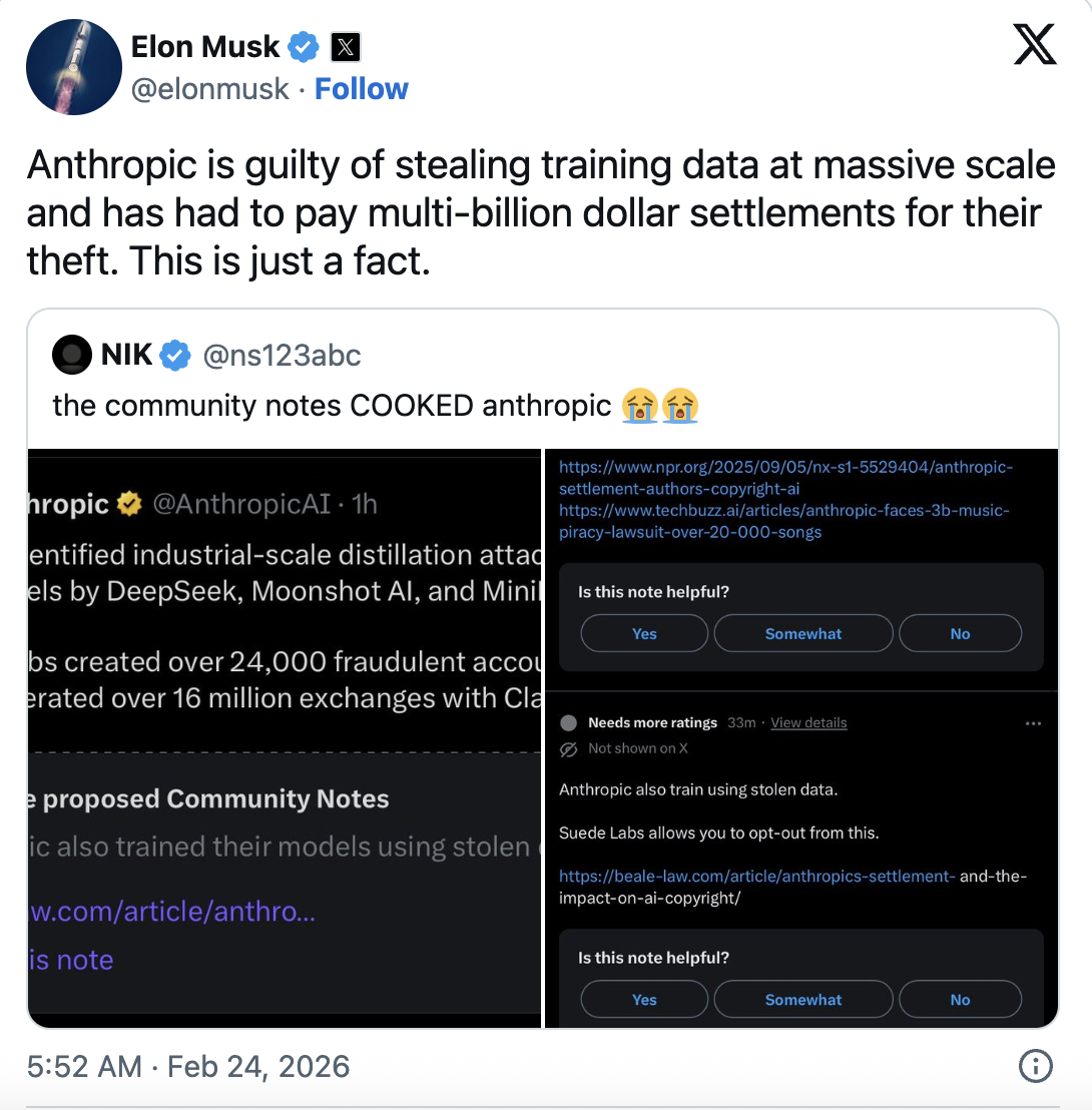 Также в этот день Илон Маск разместил на X: «Anthropic осуществил крупномасштабное хищение обучающих данных — это факт». В то же время Community Notes на X ссылались на сообщения о том, что Anthropic выплатил $1,5 миллиарда для урегулирования претензий по обучению Claude на пиратских книгах.