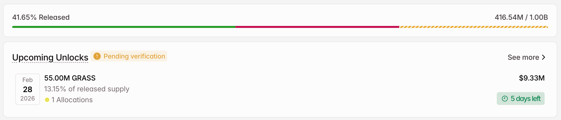 Открытие Grass также запланировано на 28 февраля, всего 55 миллионов GRASS. Несмотря на свою абсолютную стоимость (примерно $9,73 миллиона) ниже предыдущих двух, он составляет целых 13,15% от общего оборота, что делает его токеном с наибольшим процентом разблокировки на этой неделе. Это означает, что эффект разбавления может быть наиболее выражен у существующих держателей токенов. Все разблокированные токены будут распределены между участниками проекта.