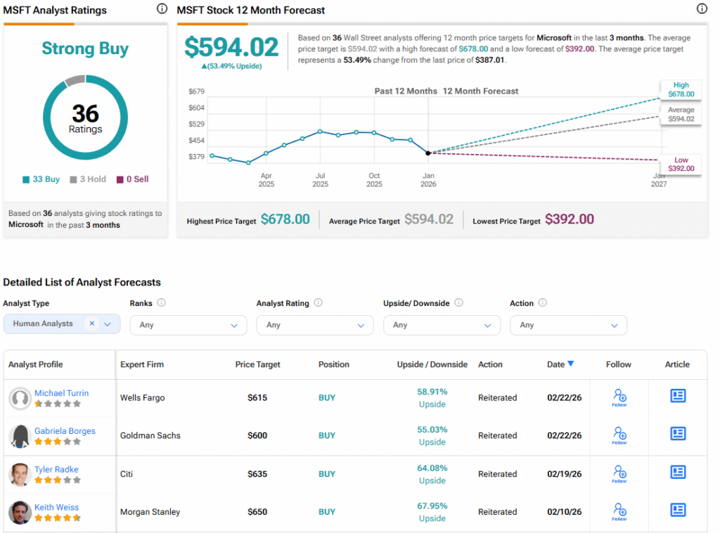 Обратившись к Уолл-стрит, консенсусное мнение аналитиков по Microsoft — сильная покупка, основанная на 33 рекомендациях «Покупать» и трех рекомендациях «Держать» за последние три месяца. Средняя целевая цена акций MSFT составляет $594,02, что предполагает потенциальный рост на 53,49%.