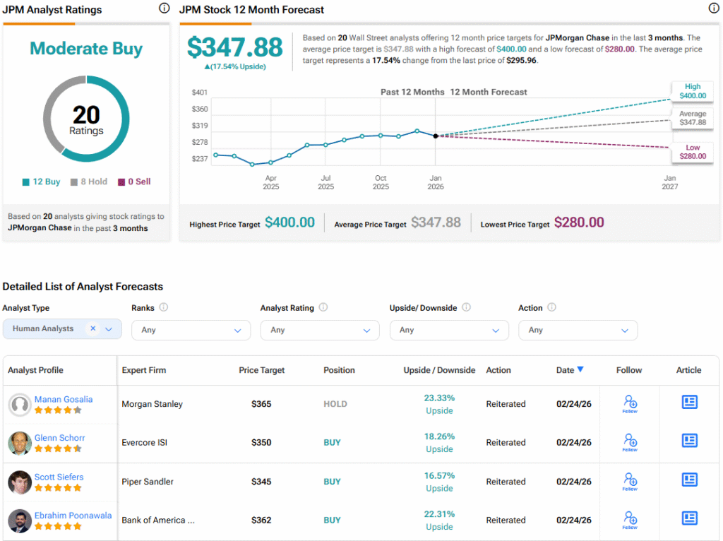 Обратившись к аналитикам Уолл-стрит, консенсусная оценка JPMorgan Chase — умеренная покупка, основанная на 12 рекомендациях «Покупать» и восьми «Держать» за последние три месяца. Средняя целевая цена акций JPM составляет $347,88, что предполагает потенциальный рост на 17,54%.