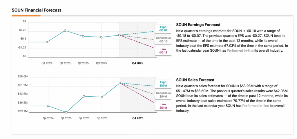 На Уолл-стрит аналитики ожидают, что SoundHound AI покажет убыток за четвертый квартал в размере 0,10 доллара на акцию, что значительно лучше по сравнению с убытком в 0,69 доллара за аналогичный период прошлого года. В то же время, выручка, по прогнозам, вырастет более чем на 55% по сравнению с прошлым годом и достигнет около 53,98 миллиона долларов.