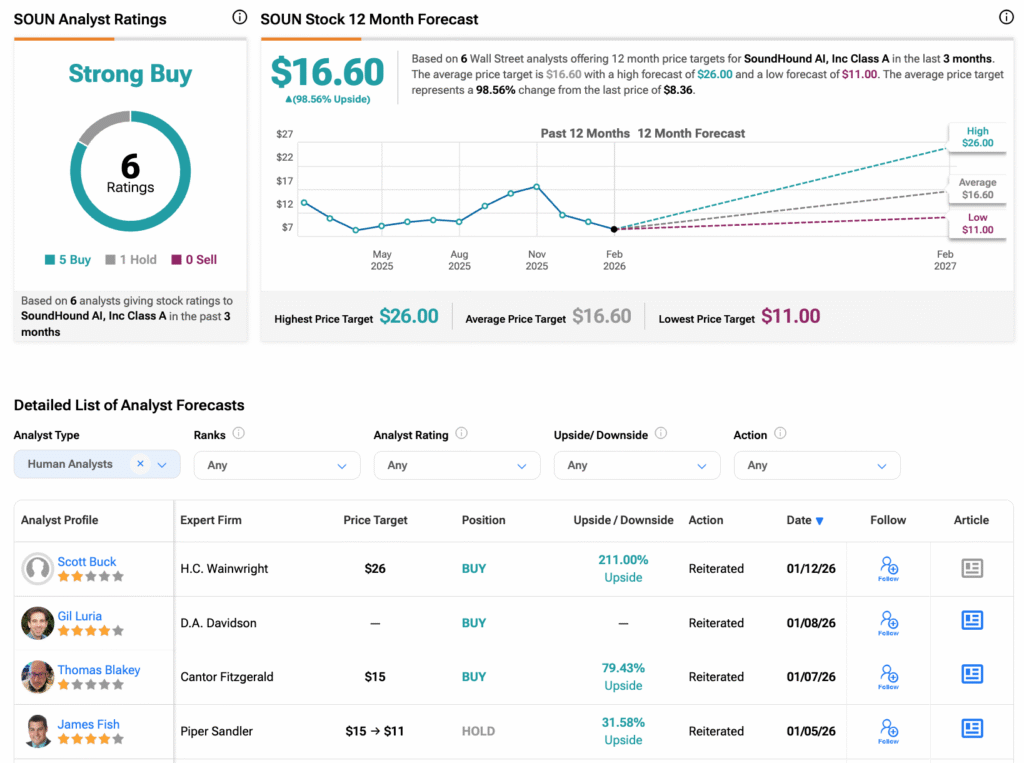 Согласно TipRanks, акция SOUN получила рейтинг «Сильная покупка», за последние три месяца было выставлено пять рекомендаций «Покупать» и одна — «Держать». Средняя целевая цена на акции SoundHound составляет 16,60 долларов, что предполагает потенциальный рост на 98,56% от текущего уровня.