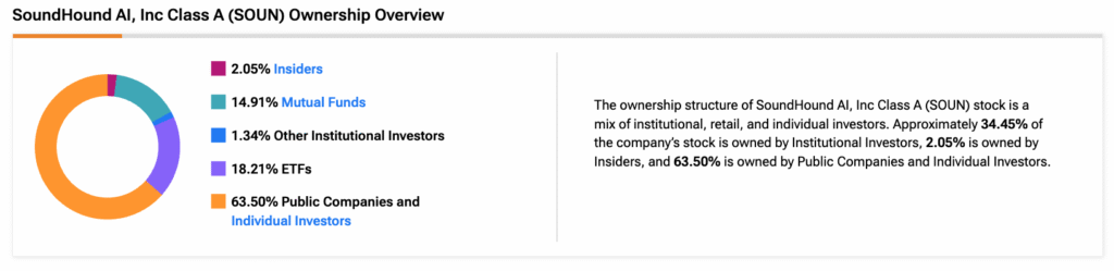 Согласно инструменту владения TipRanks, публичные компании и частные инвесторы владеют 63,50% акций SoundHound. За ними следуют ETF, паевые фонды, инсайдеры и другие институциональные инвесторы с долями 18,21%, 14,91%, 2,05% и 1,34% соответственно.