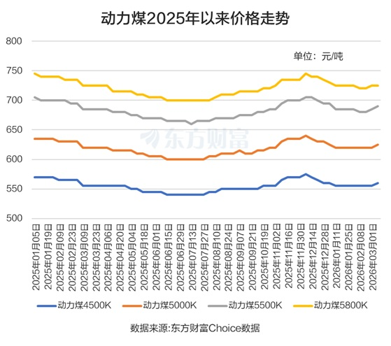 Данные Choice от Eastmoney показывают, что в последнее время цены на энергетический уголь явно выросли, особенно на уголь 5500K, цена на который к 8 марта составила 690 юаней за тонну, что на 10 юаней больше по сравнению с серединой февраля.