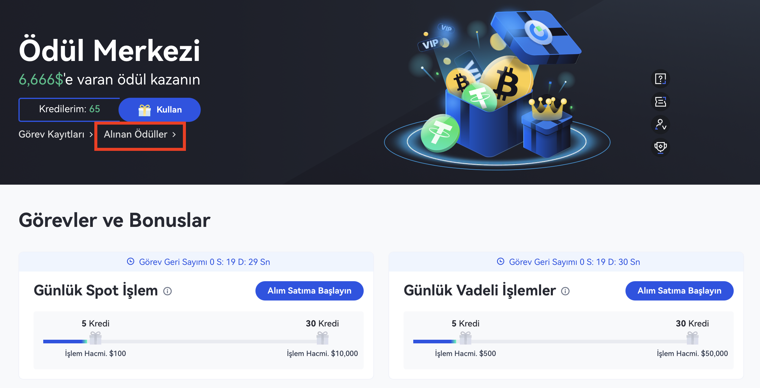 1. Adım: Hesabınıza giriş yapın ve Gate Ödül Merkezine girmek için "Hediyeler"-"Bonus Kampanyaları" veya "Görevler ve Bonuslar" bölümüne gidin.